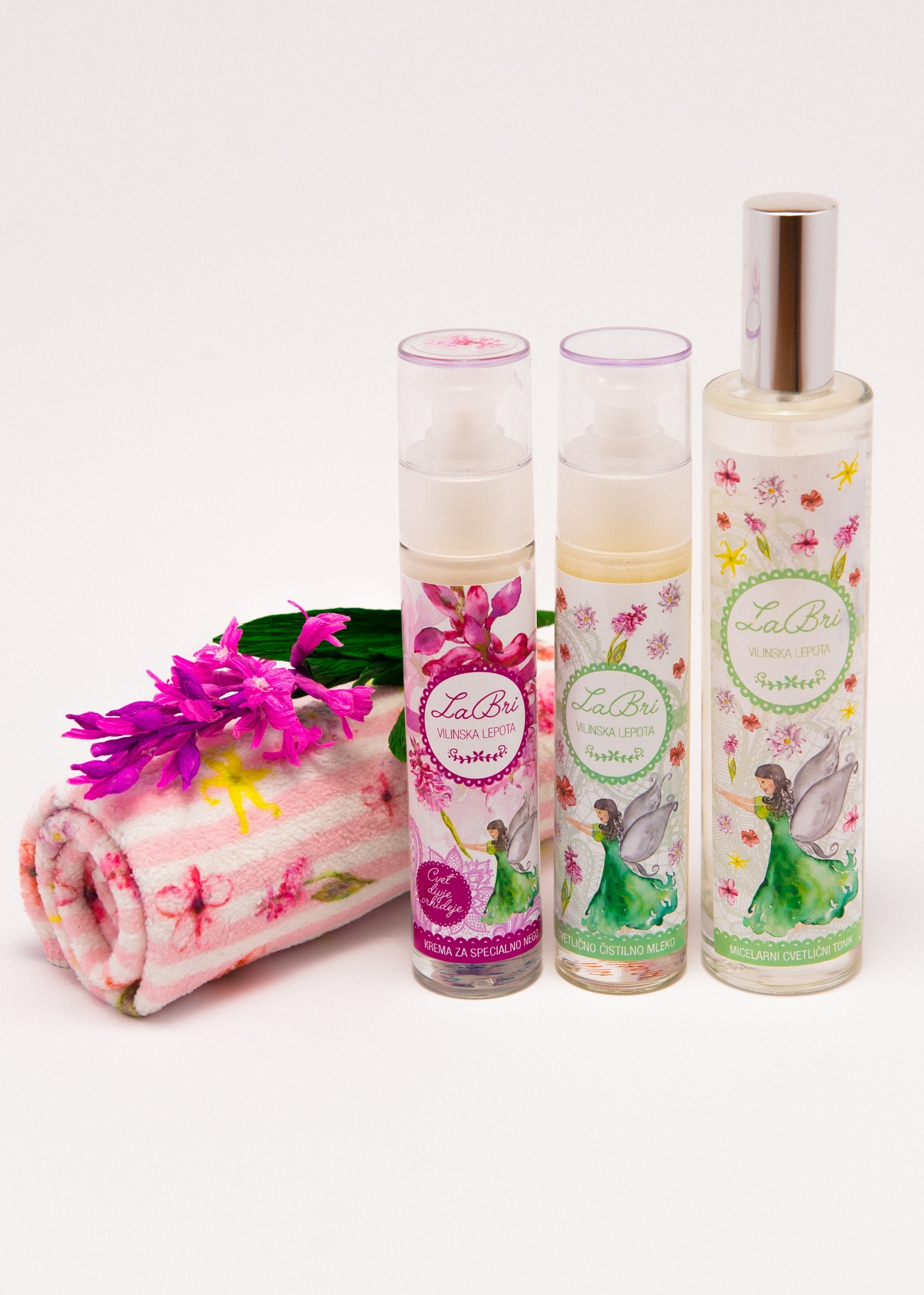 BRISAČKA ZA OBRAZ – Na eni strani potiskana z vilinko LaBri in cvetlicami, na drugi strani bela. Material: na potiskani strani 100% mikrofibra, na beli strani 100%bombaž. Velikost 50 cm × 30 cm.